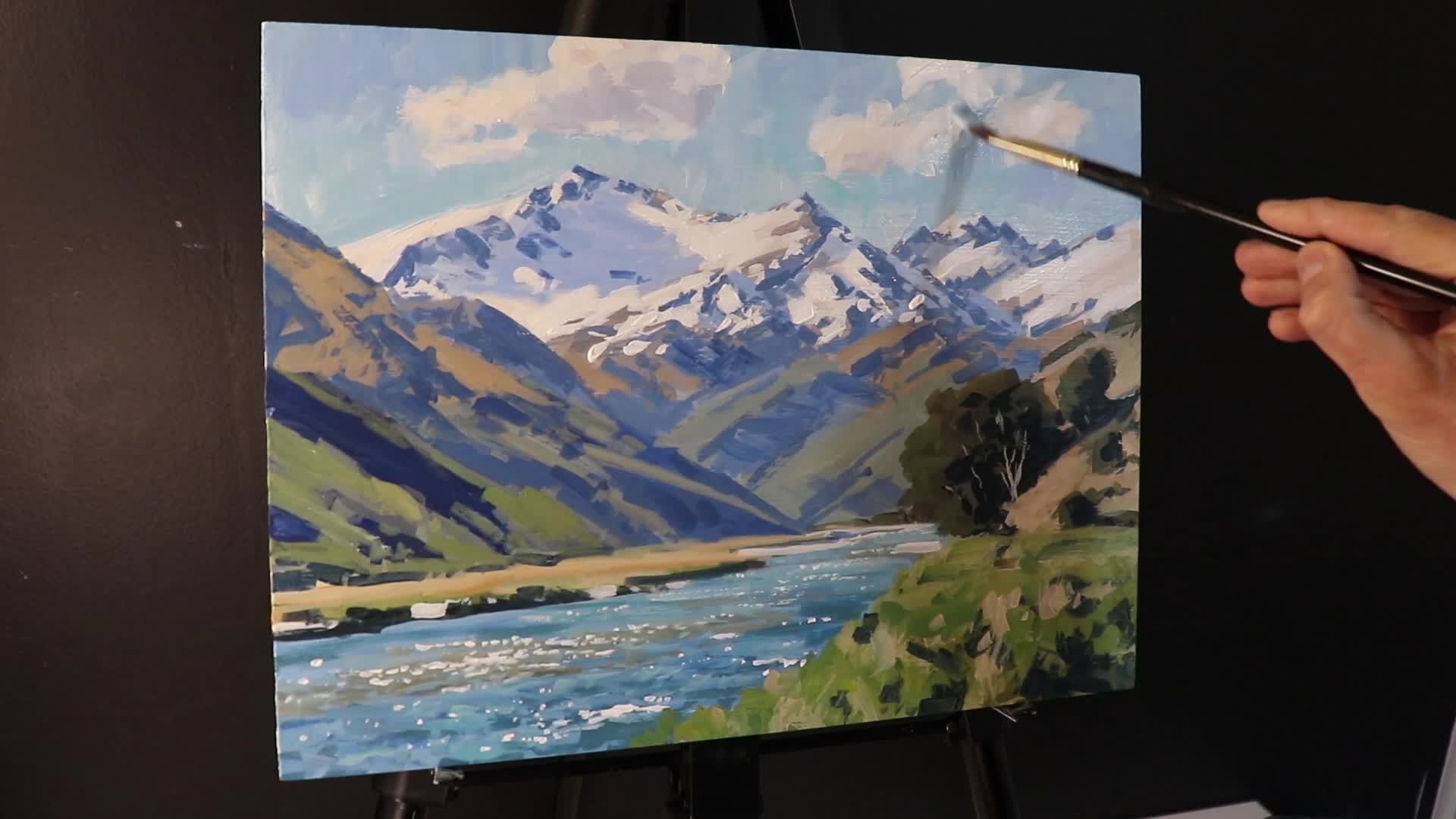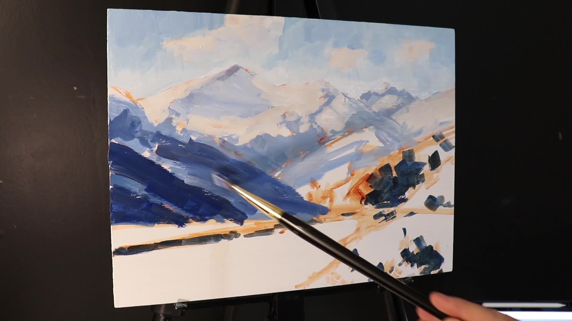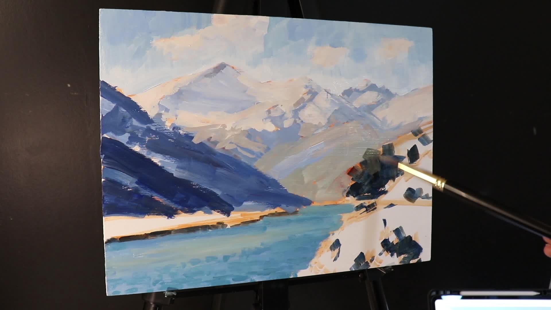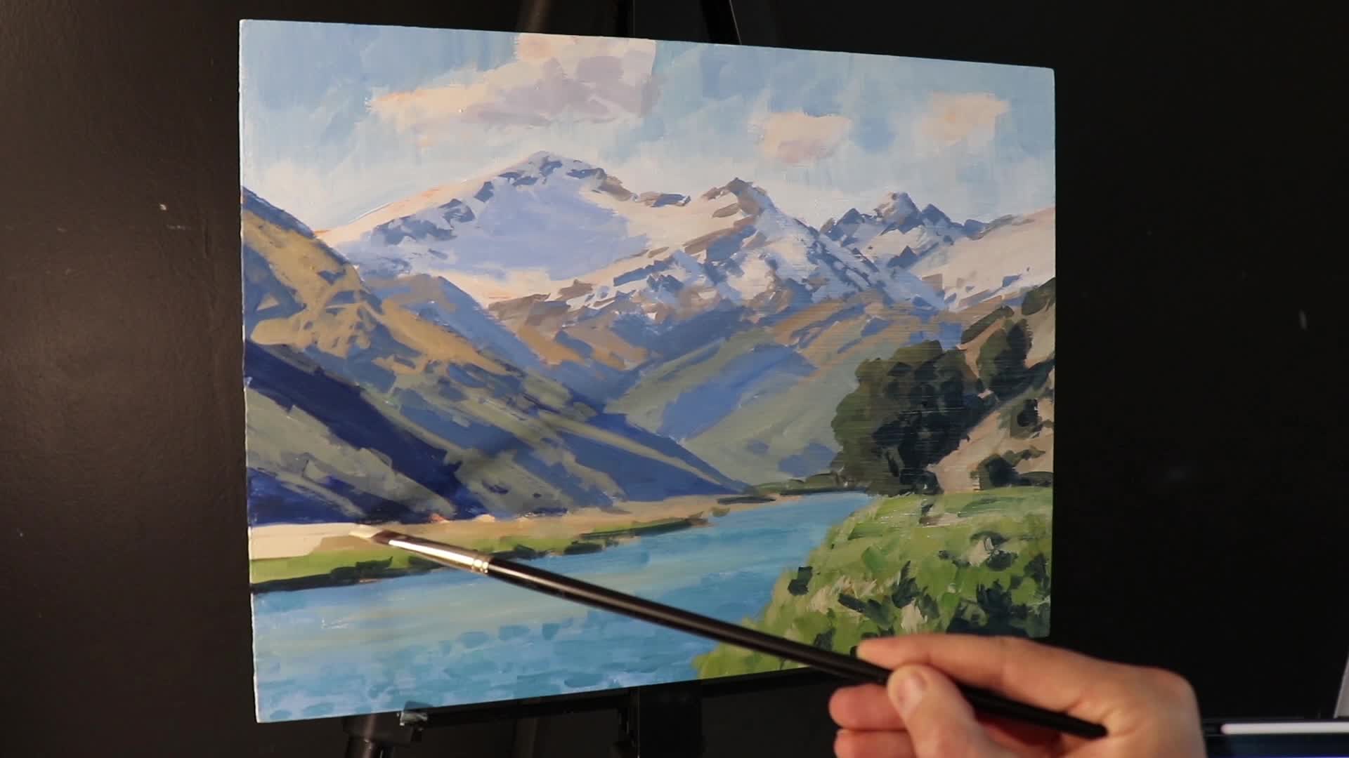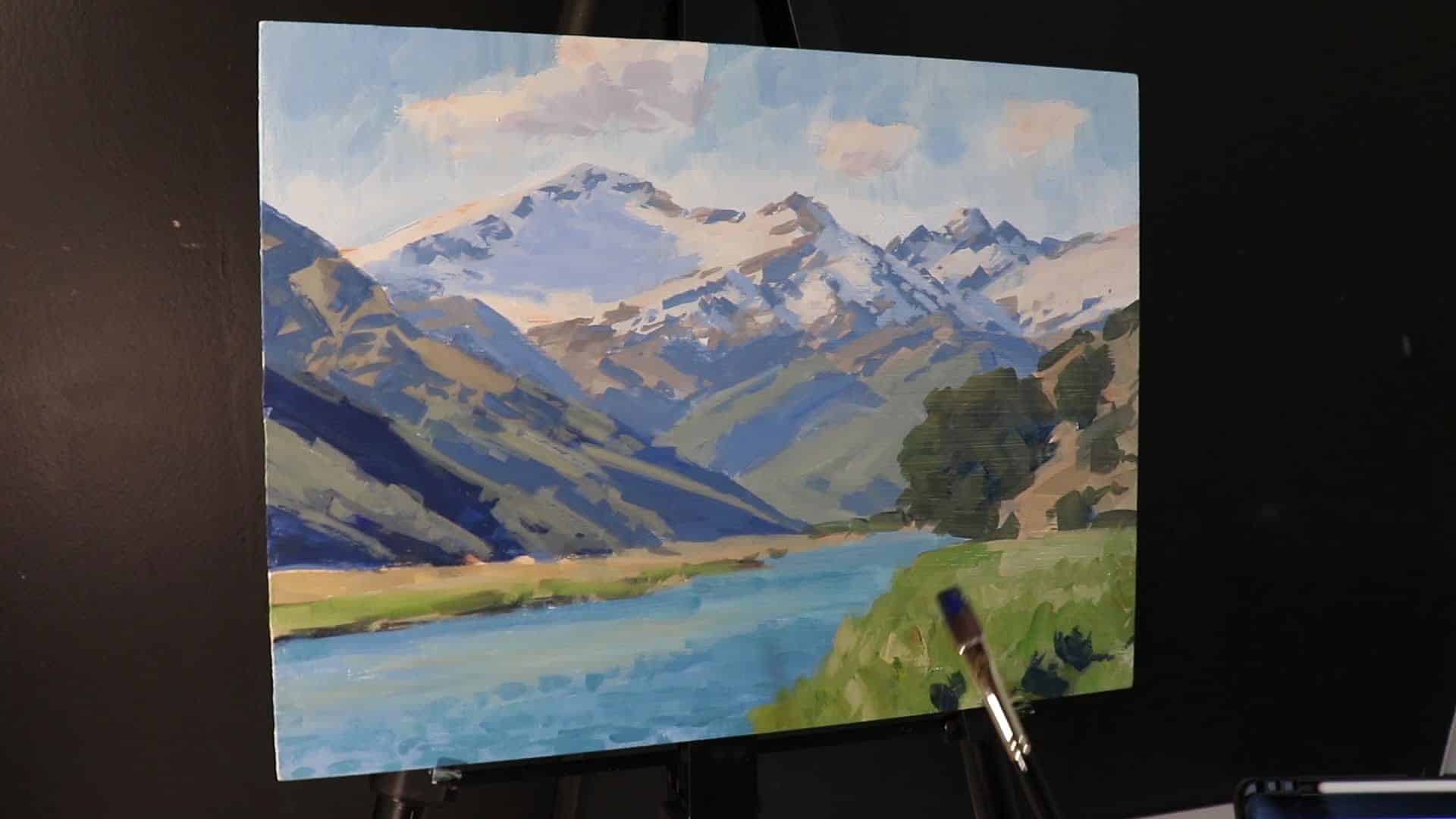 “A lot of shadows, especially in New Zealand and in the mountains, tend to have a blue cast to them. So this is something that I want to convey from the get go in this painting.”