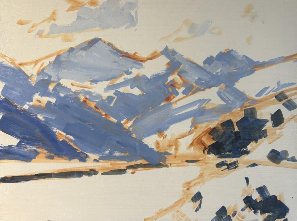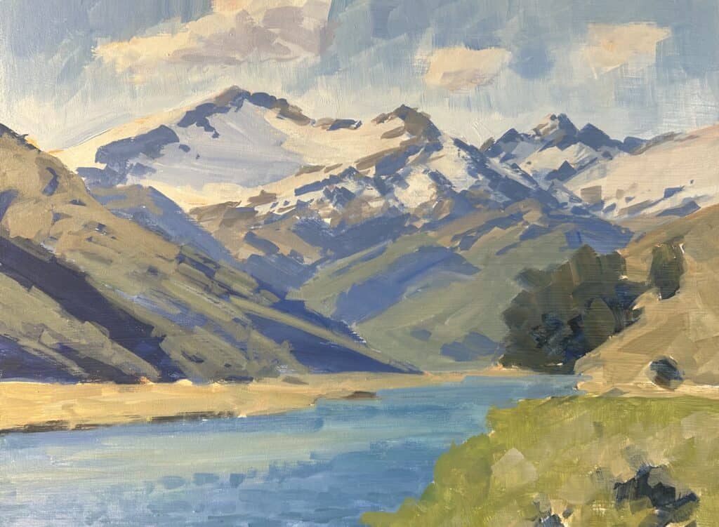 Imagine a crisp day in southern New Zealand, standing in front of the dramatic silhouette of Mt Clarke. That’s the memory that inspired this painting. A little while back, I joined a plein air painting day with a group of artists. The mood was light and the landscape was absolutely stunning—an artist’s dream.