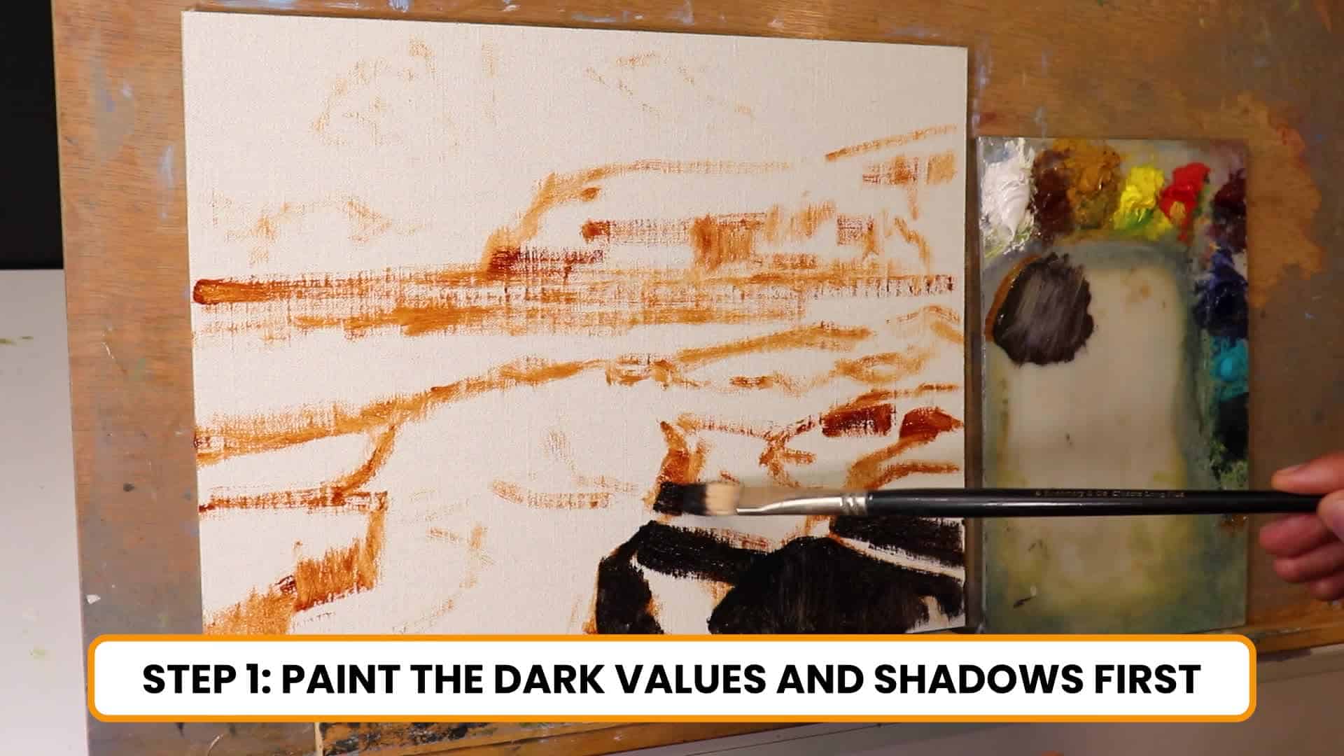 - Establishes your tonal framework: Painting your shadows and darks first anchors the painting and helps with later color choices.