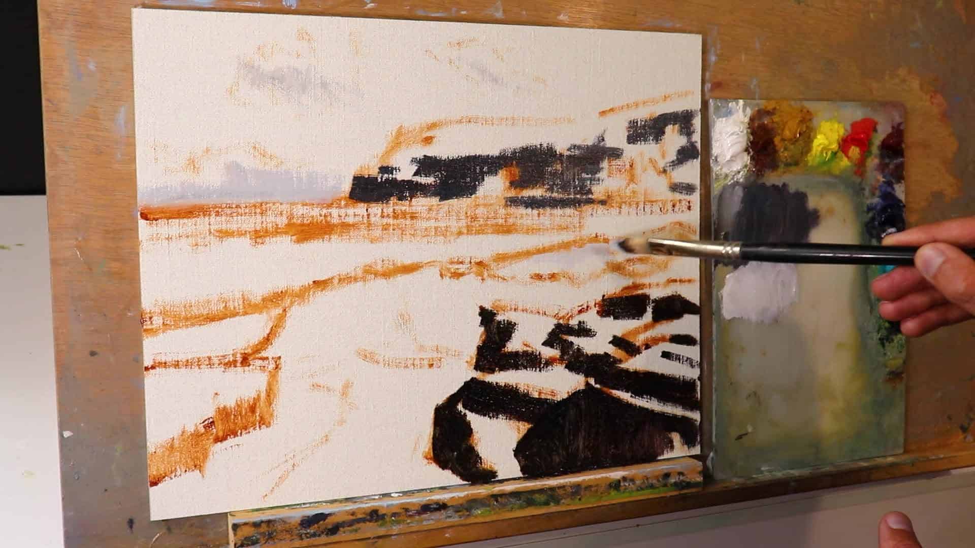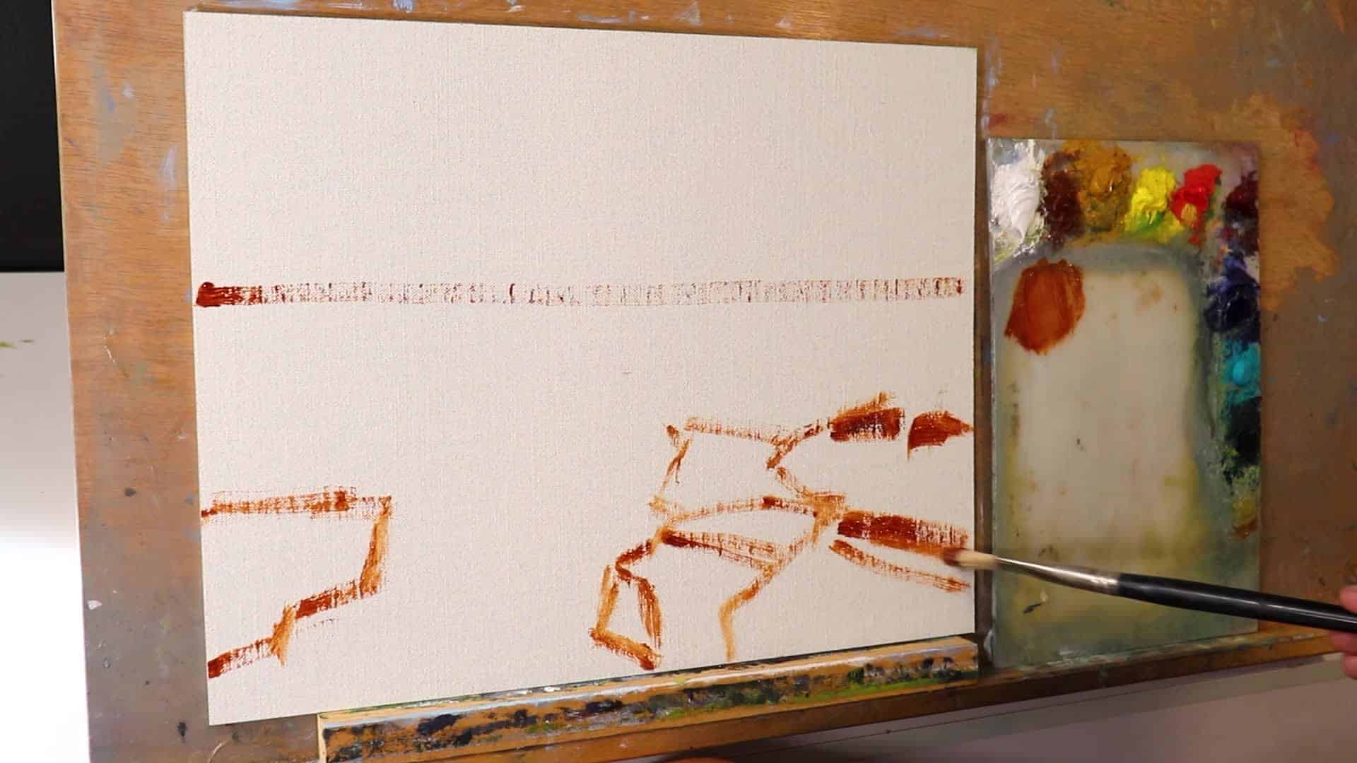 Above: Blocking in the basic composition with burnt sienna on linen panel.