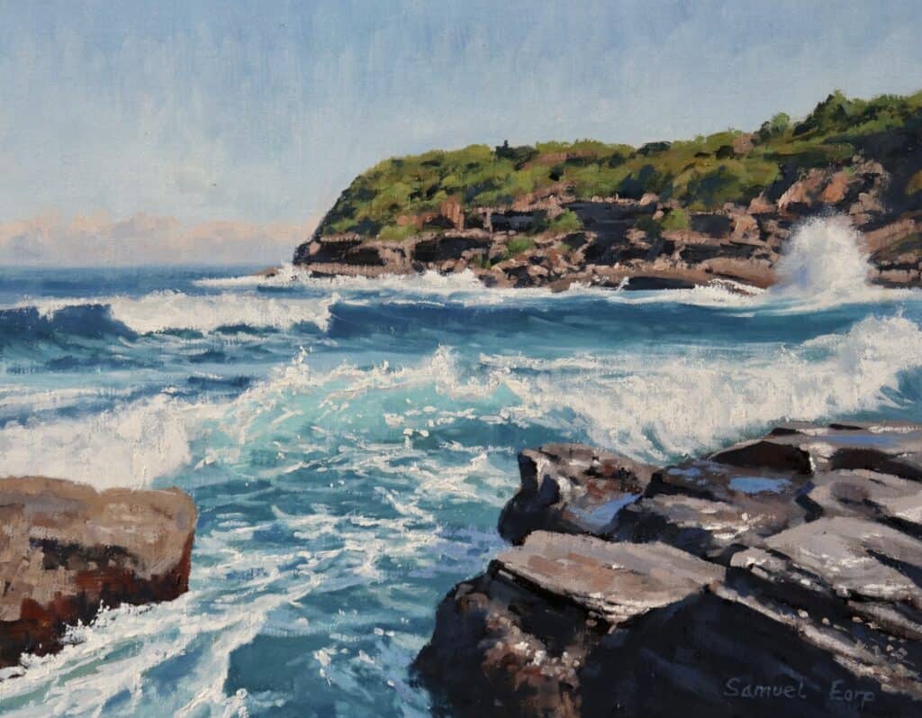 Above: Finished painting of Frazer Beach, alive with breaking waves, dynamic foam, and golden sunlight.