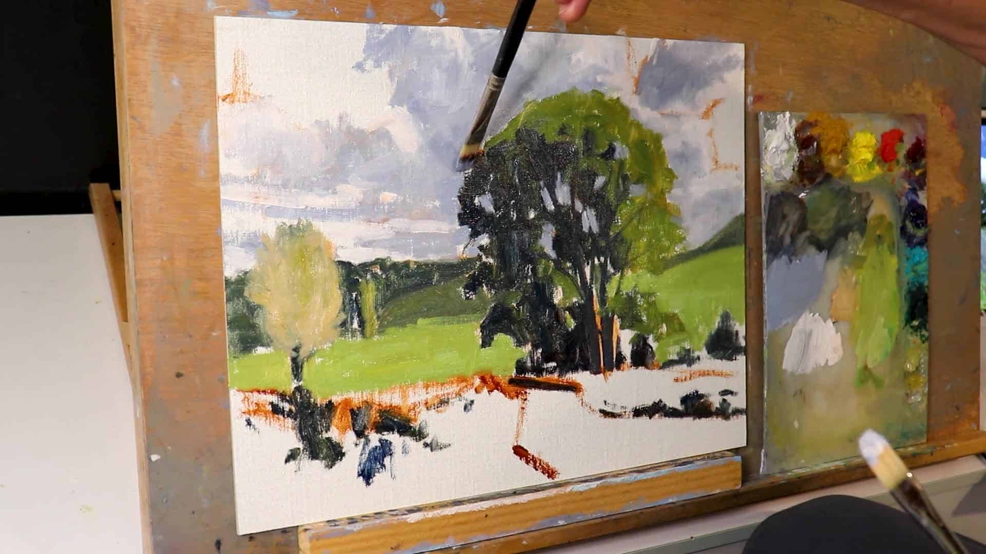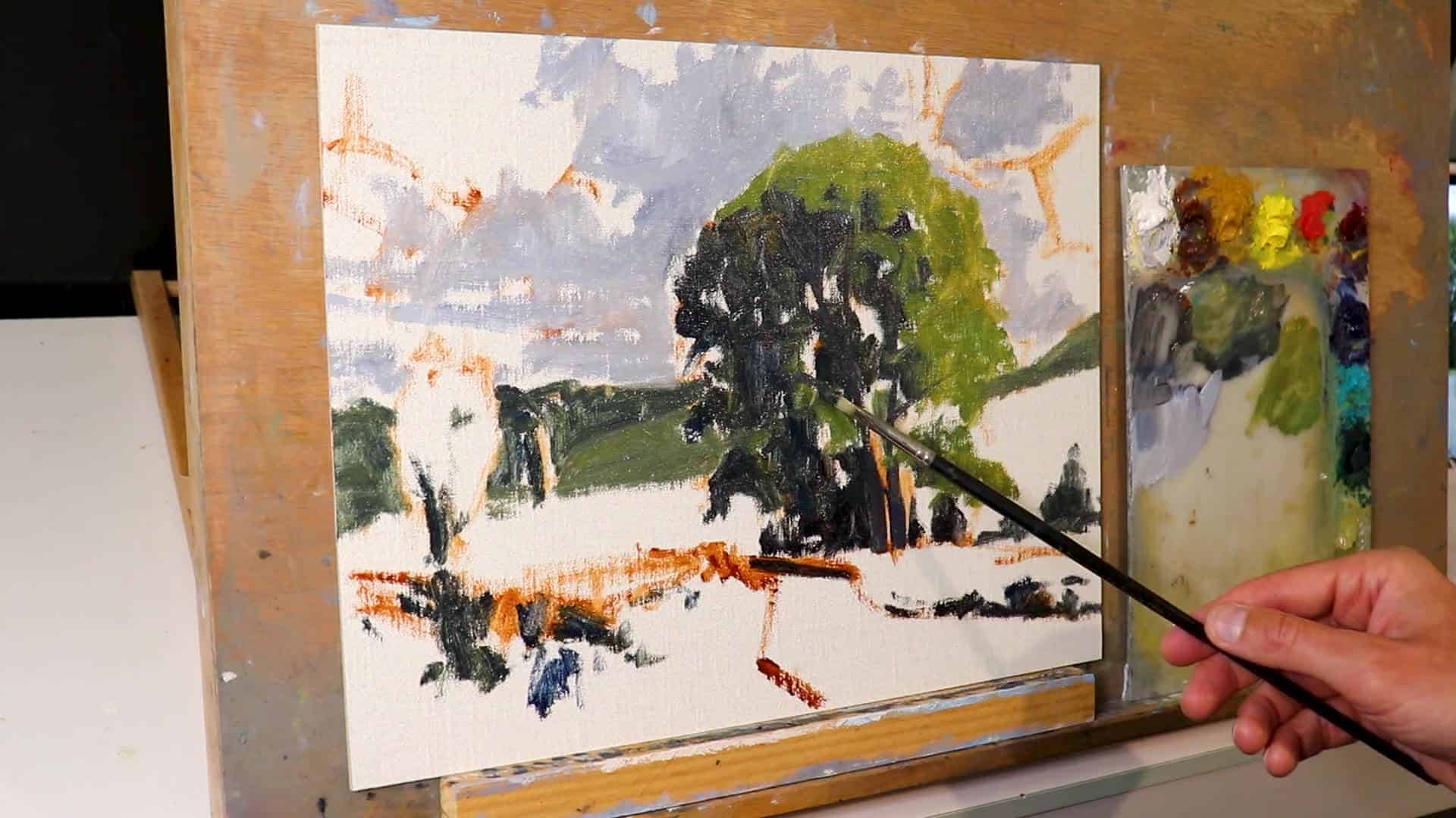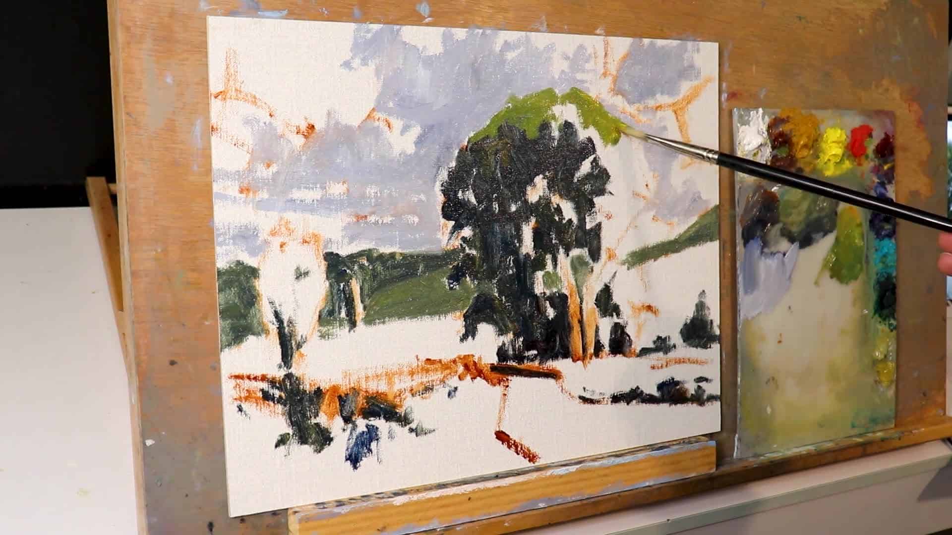 To create your greens for the canopy, mix ultramarine blue, yellow ochre, cadmium yellow, along with touches of burnt sienna, phthalo green, and titanium white. The goal at this point isn’t precision but capturing the tree’s general shape and form. I keep my mixtures loose and varied – nature’s greens are never uniform, so neither should mine be.