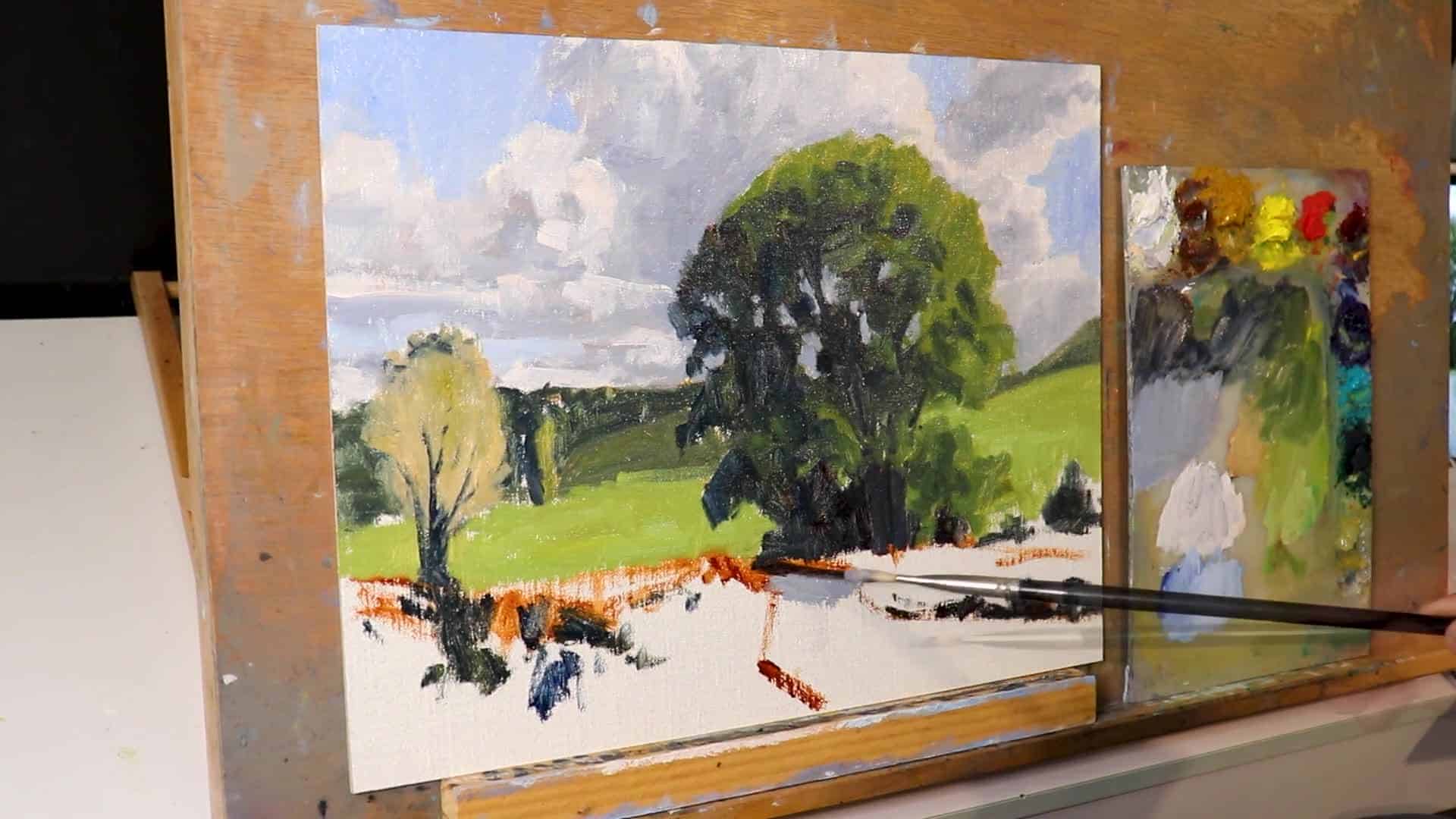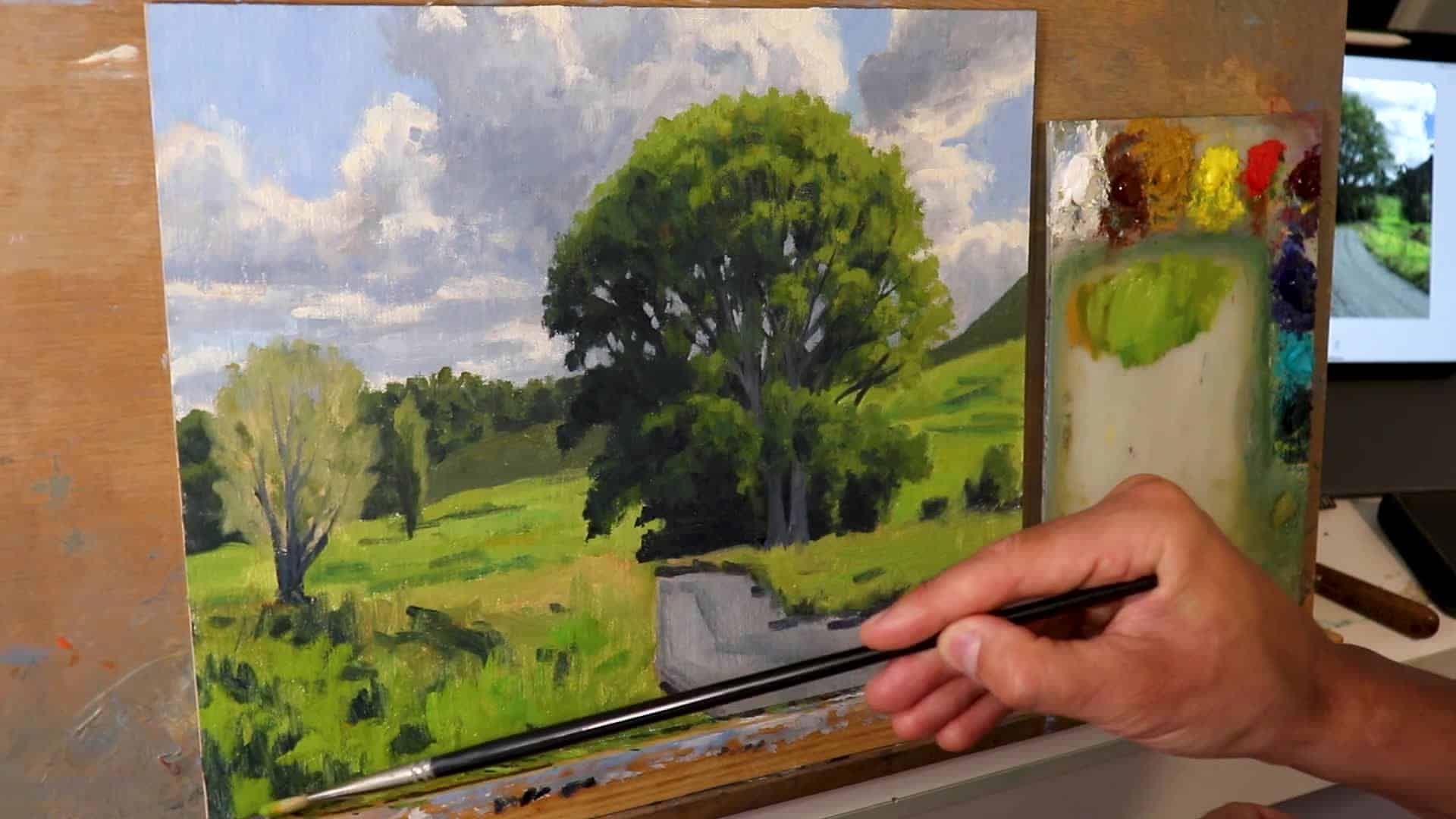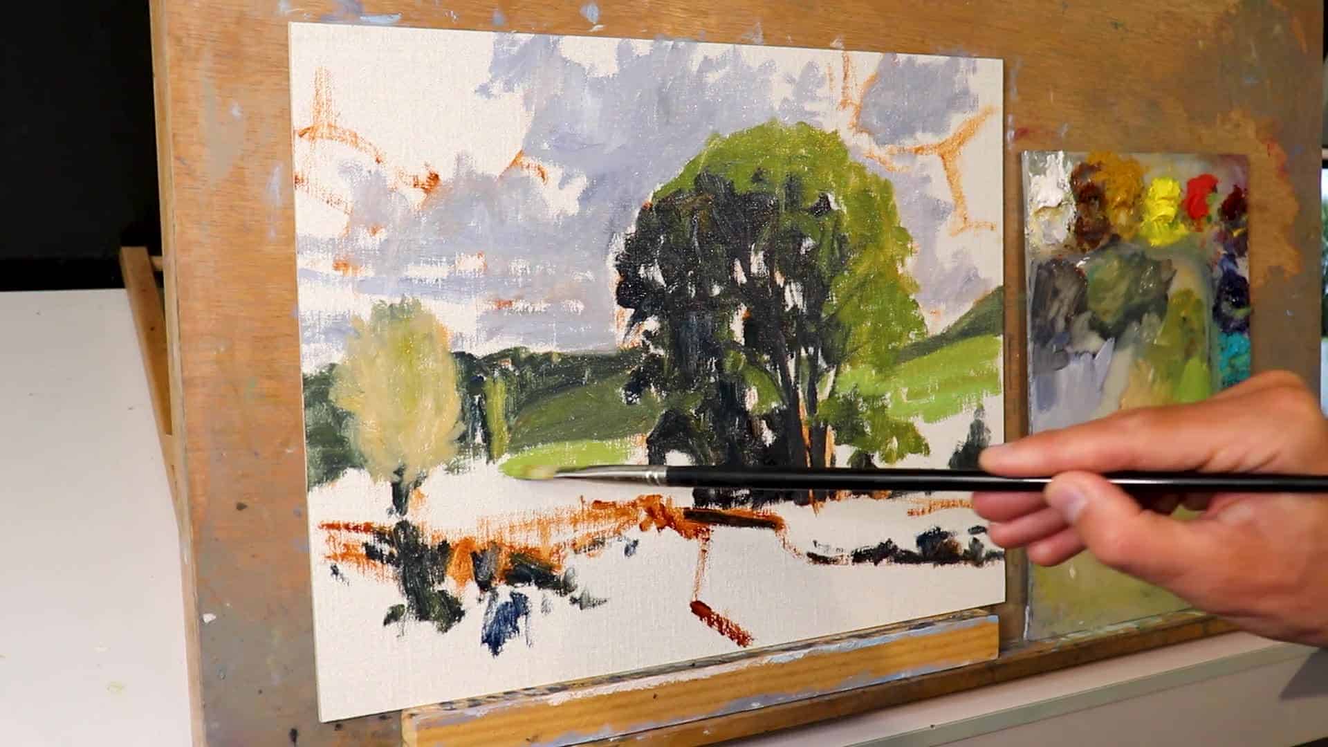 To create your greens for the canopy, mix ultramarine blue, yellow ochre, cadmium yellow, along with touches of burnt sienna, phthalo green, and titanium white. The goal at this point isn’t precision but capturing the tree’s general shape and form. I keep my mixtures loose and varied – nature’s greens are never uniform, so neither should mine be.