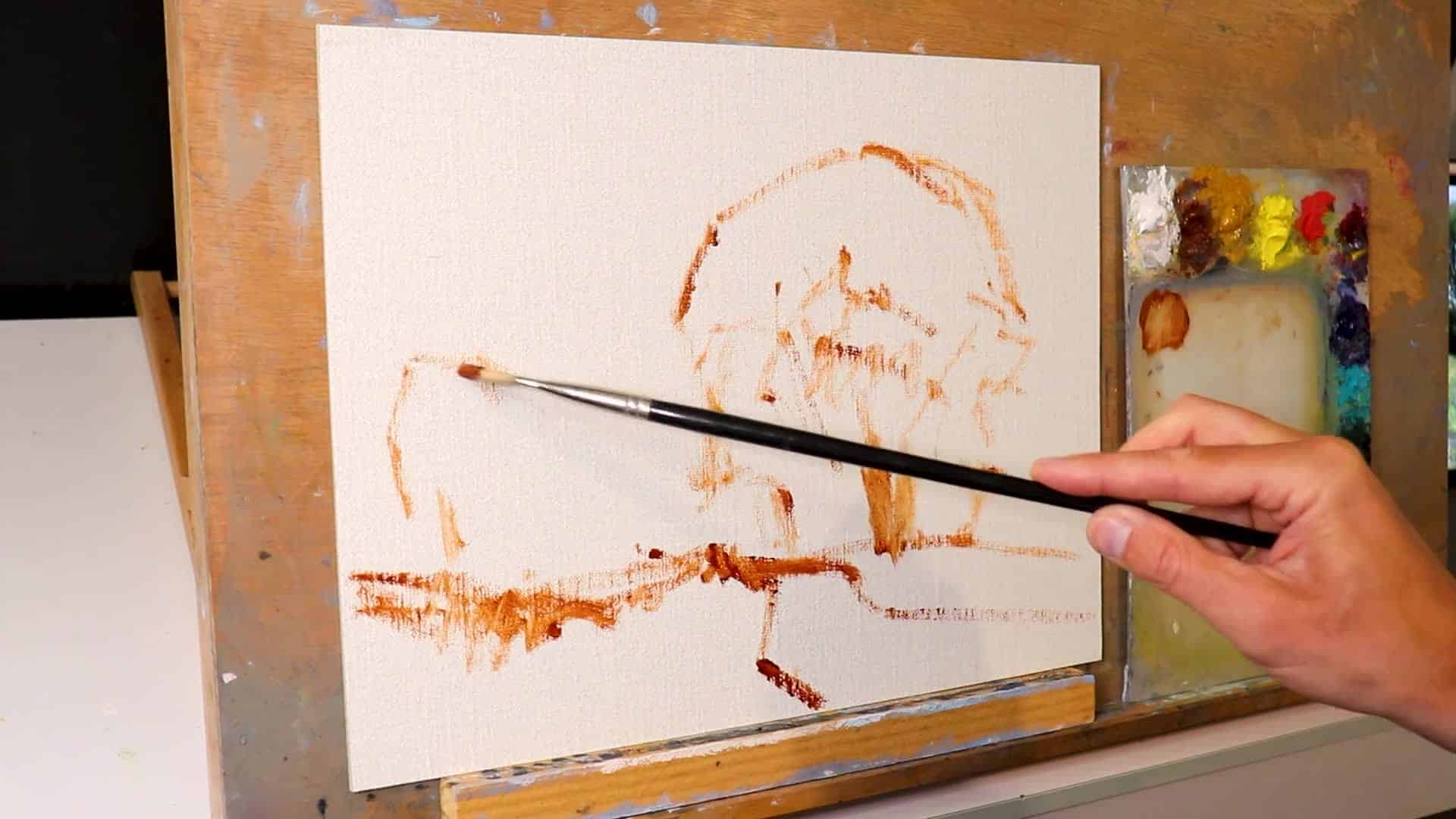 This stage, known as the blocking-in stage, requires using loose brush strokes with larger brushes. For this exercise, I’m working with number five and number six bristle flat brushes.