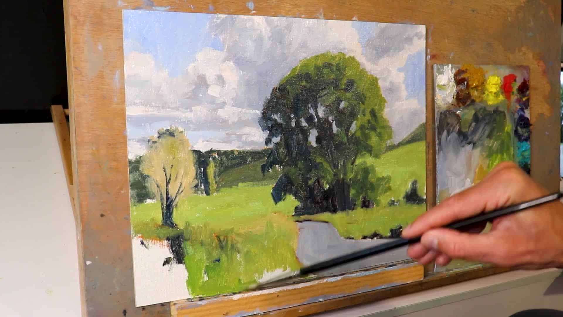 Trees often contain some of the darkest values within a landscape. In the foreground, these values are even more pronounced. As you move towards the background, both darks and lights soften, providing depth. I always remind myself that these dark areas aren’t just “dark green” – they’re opportunities to create real dimension and make the lighter areas pop when I add them later.