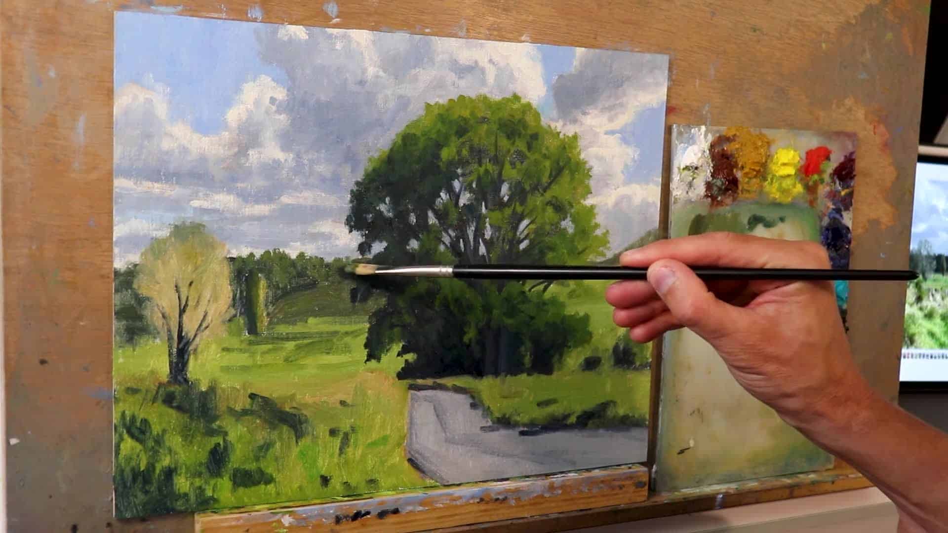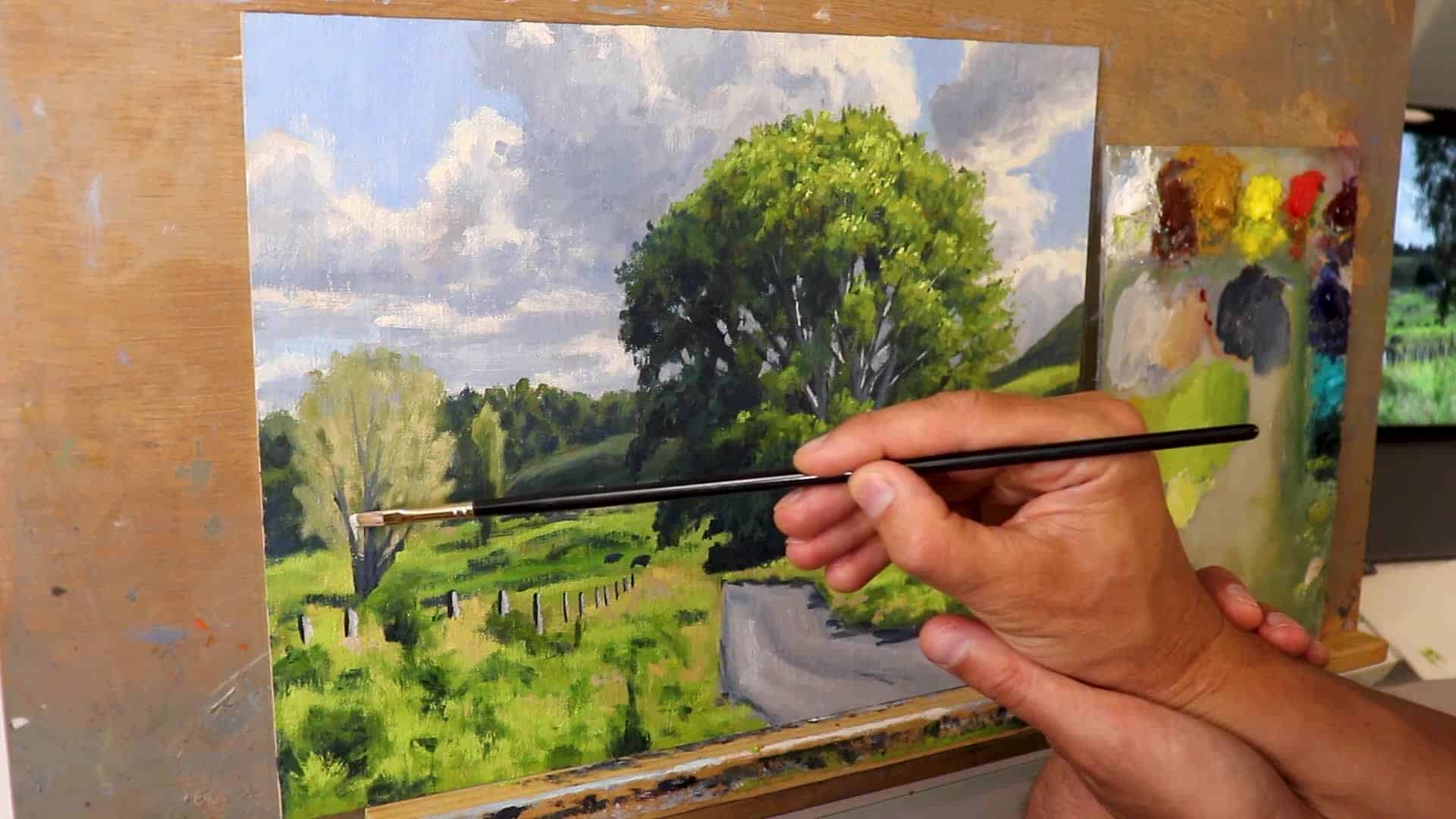 - Introduce lighter tones to grass and foliage using brushes like a quarter-inch bristle dagger brush.